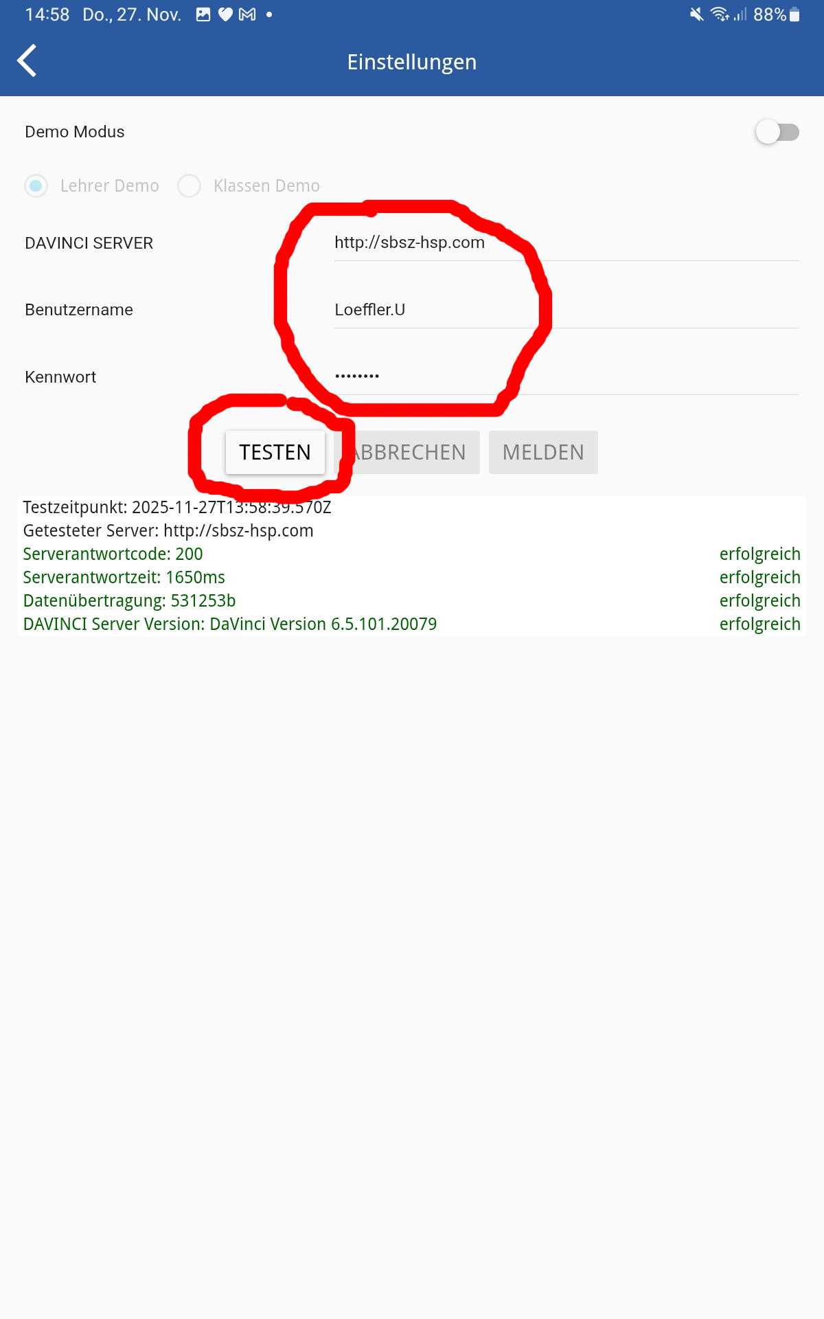 Wenn der Test erfolgreich verlaufen ist, links oben auf „<“ tippen.